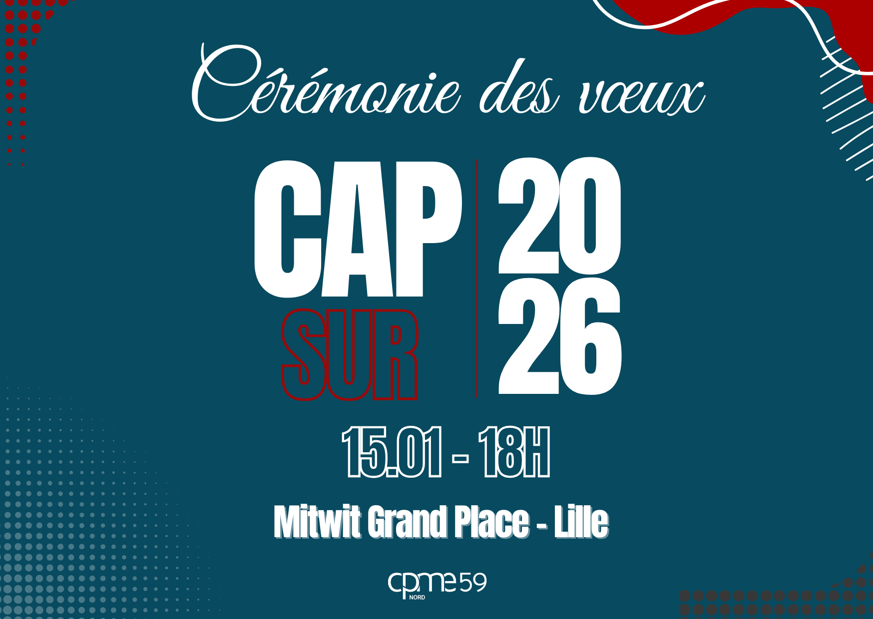2026jeu15jan18h00jeu21h00Cérémonie des voeux CPME NORD18h00 - 21h00(GMT+00:00) Mitwit Grand Place, 68 rue Saint Etienne Lille