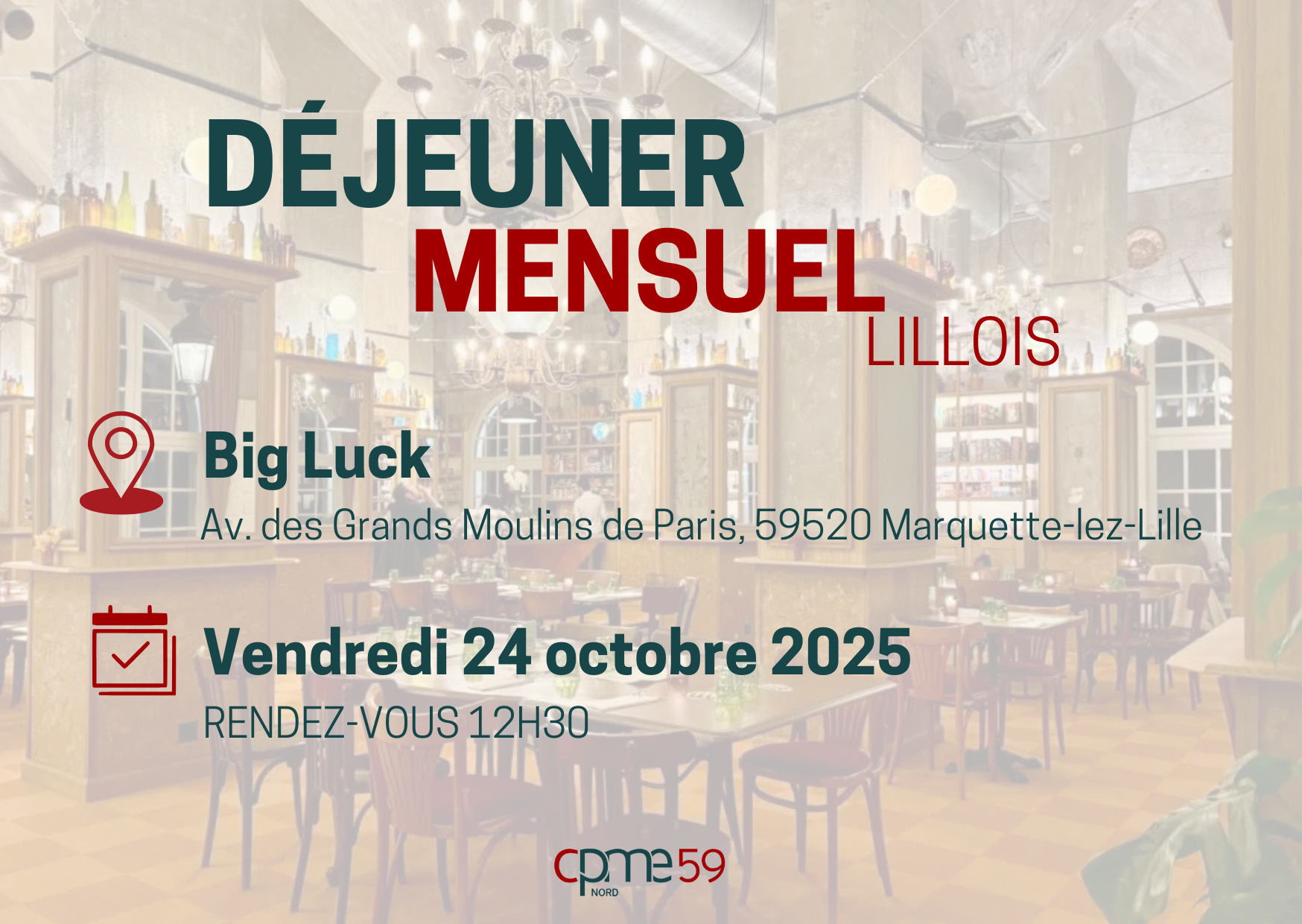 2025ven24oct12h30ven14h00Déjeuner Lillois - 24 octobre 2025Découvrez le Big Luck à Marquette-Lez-Lille le 24/1012h30 - 14h00(GMT+00:00) Big Luck Marquette-Lez-Lille, Av. des Grands Moulins de Paris, 59520 Marquette-lez-Lille